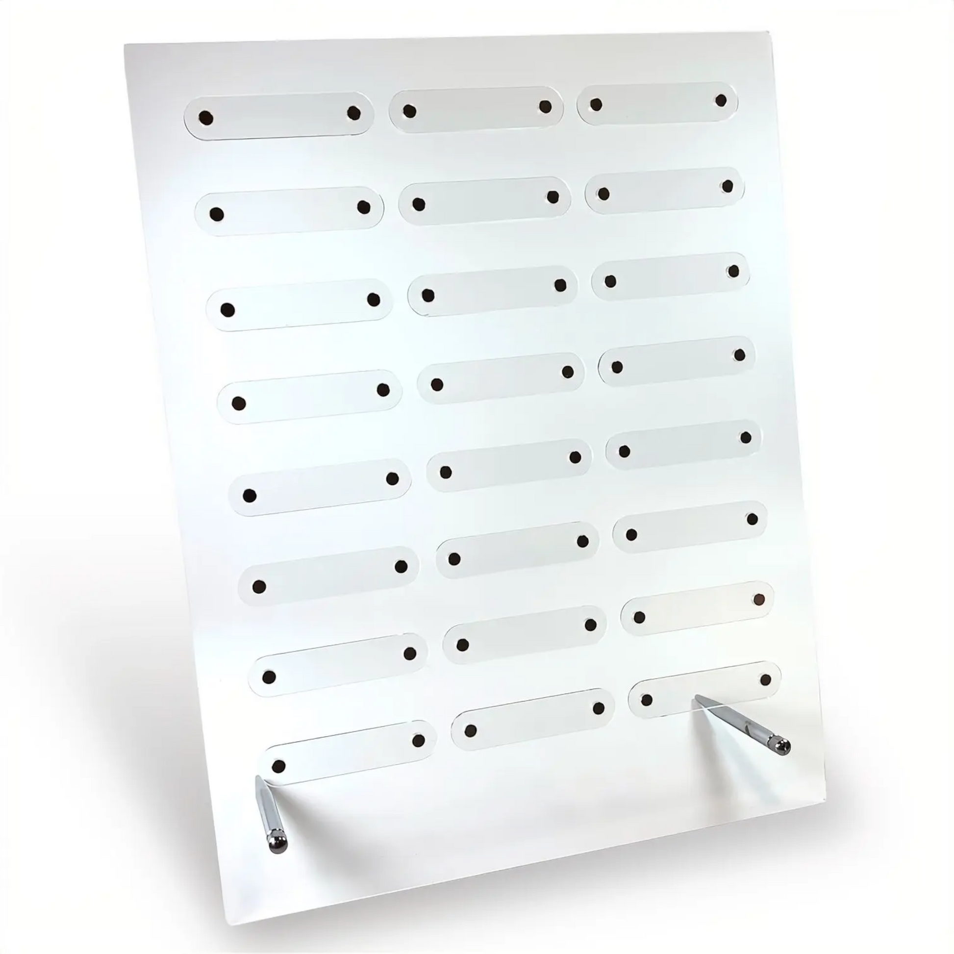 It comes with 24 magnetic display strips which hold firmly to the board. Removable stainless steel support legs which can easily be removed to store when not in use.